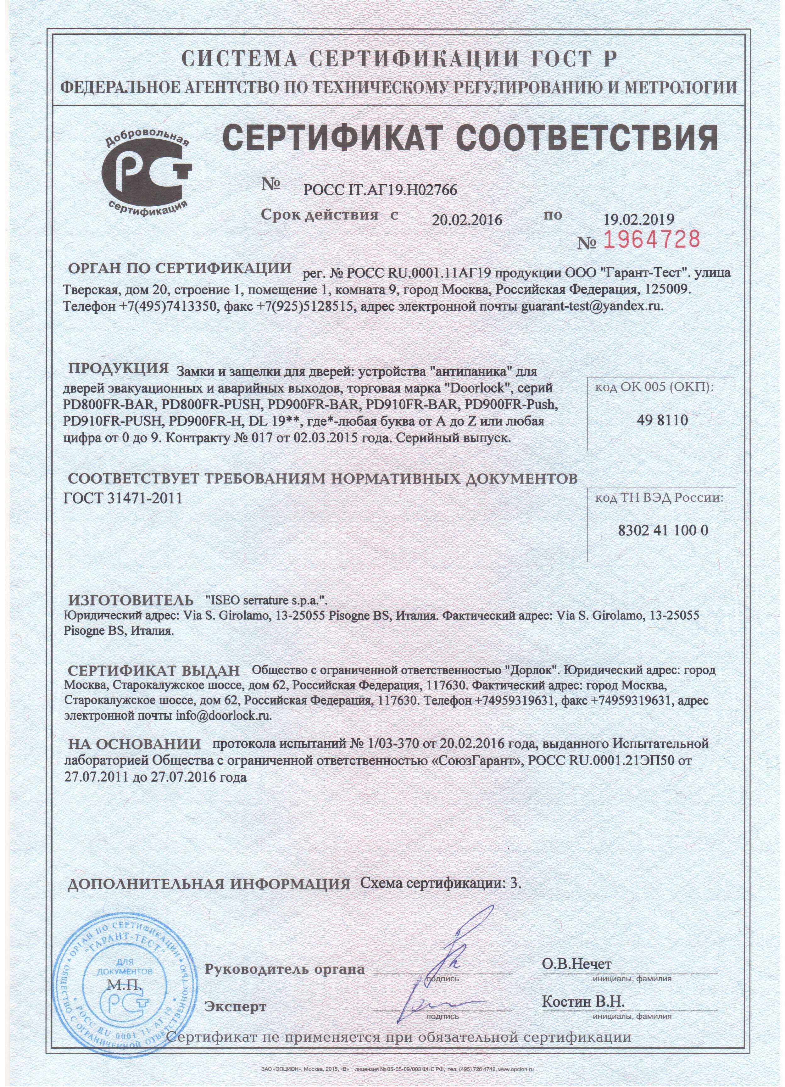 3. Стандарт качества. Все наши механизмы и комплектующие систем «антипаника» сертифицированы по ГОСТ 31471-2011. Сертификатом подтверждено, что их разрешено использовать как на эвакуационных, так и на аварийных дверях.