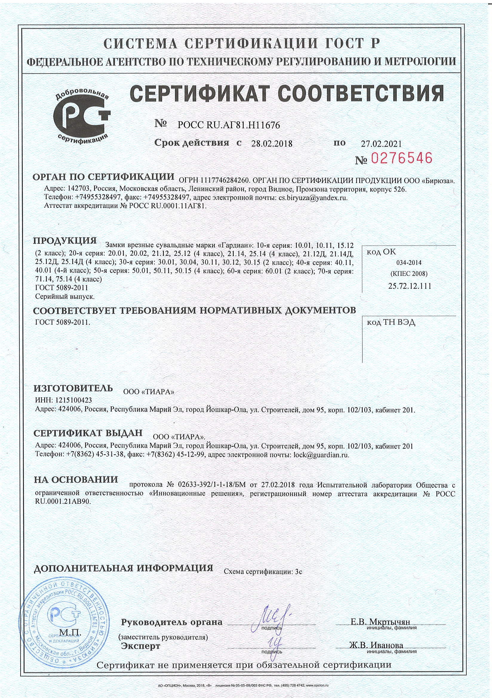 - Сертификат соответствия. Замки врезные сувальдные ГОСТ 5089-2011. Гардиан